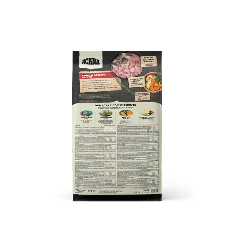 Bereid in onze gecertificeerde keukens in Canada is Acana Dog hondenvoer Sport & AgilityĀ rijk aan lokaal gefokte scharrel kip, scharrel eieren, in het wild gevangen platvis, zongerijpt fruit en groenten ā geleverd rijk aan voedingsstoffen en door boeren en telers uit onze regio zodat jouw actieve hond in optimale fysiekeconditie blijft.