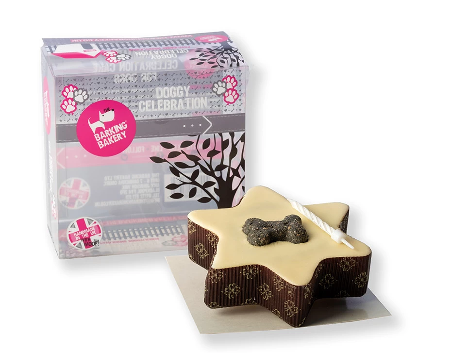 Heerlijke taart met yoghurt en omgeven met knapperige botvormige koekjes voor de hond.