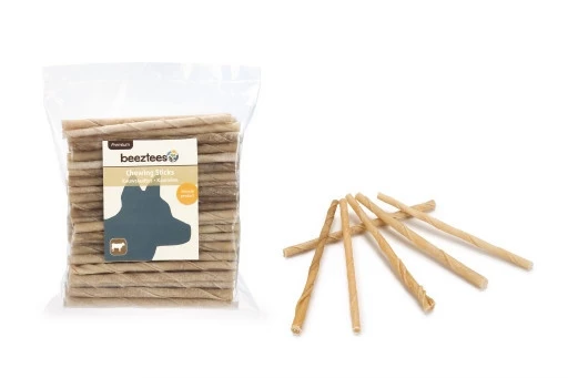 Beeztees gedraaide kauwstaafjes 4 tot 6 mm. Verpakt per 100 stuks. Premium Thaise kwaliteit. Een lekker tussendoortje voor uw hond.