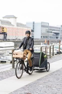 - Dankzij de parkeerremmen op beide wielen blijft de geparkeerde fietskar stabiel en kan deze niet zomaar wegrollen.
