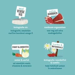 Samenstelling: Biologisch varken*, biologische kip*, biologische vis* 14%, mineralen, biologische wortels* 2%, biologische erwten* 2%, biologische venkel* 0,1%, biologische rozenbottels 0,1%, biologische kamille 0,1%.