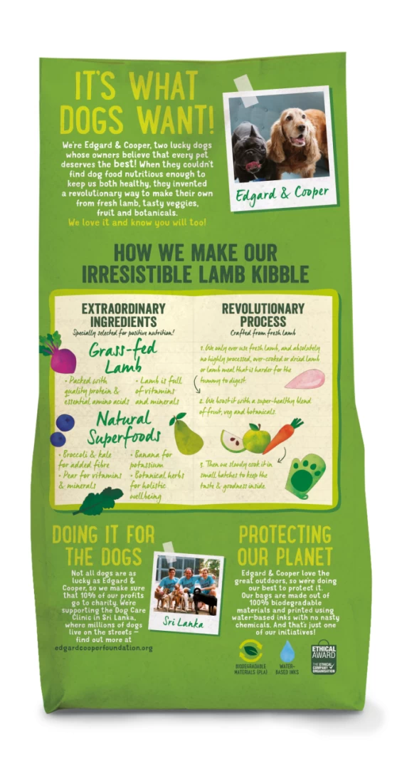 In Edgard & Cooper hondenvoer Adult graslam wordt enkel vers graslam gebruikt en absoluut geen bewerkte, overgare of gedroogde lam of lamsmeel dat moeilijker is voor de buikjes om te verteren. Daarnaast wordt er een supergezonde mix van fruit, groenten en kruiden toegevoegd.