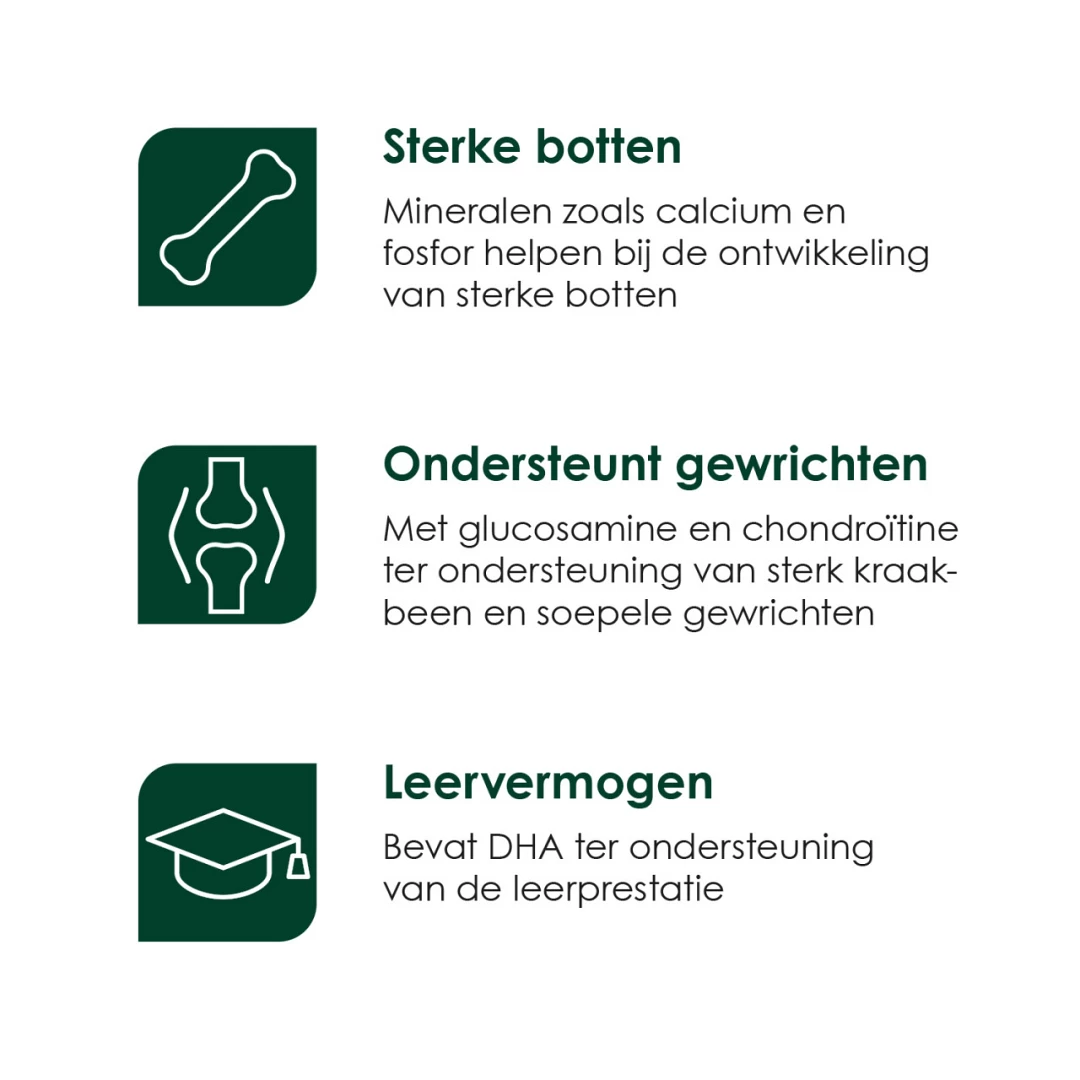 |  | Ondersteunt gewrichten Met glucosamine en chondroïtine ter ondersteuning van sterk kraakbeen en soepele gewrichten.  |