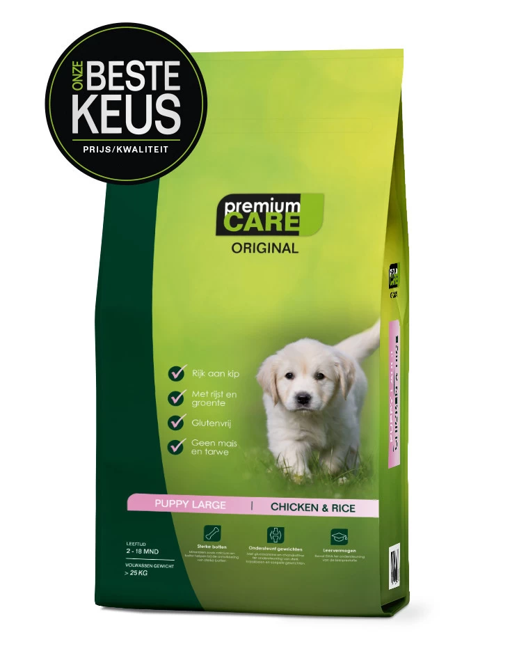 Premium Care Original – Puppy Large Chicken & Rice is een glutenvrije, complete droge hondenvoeding speciaal samengesteld om te voorzien in de voedingsbehoeften van pups van grote rassen en draagt bij tot een gezonde botvorming en optimale ontwikkeling.