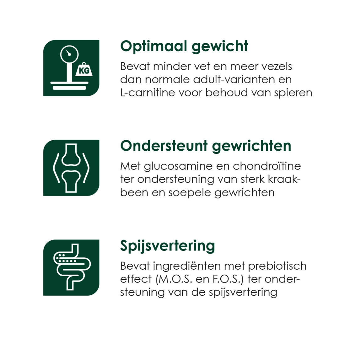 | Â | Optimaal gewicht Bevat minder vet en meer vezels dan normale adult-varianten en L-carnitine voor behoud van spieren. Â |