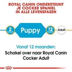 Met zijn smekende ogen en mooie vacht weet de Cocker Spaniel pup iedereen te betoveren. Laat je niet altijd inpakken door deze lieve blik. Sommige Cocker Spaniels hebben de neiging tot snelle gewichtstoename. Dus tussendoortjes: Liever niet. Geef je Cocker liever voeding op maat, zoals Royal Canin Cocker Puppy. Zodat hij in deze belangrijke groeifase alles binnenkrijgt om sterk en gezond te worden.