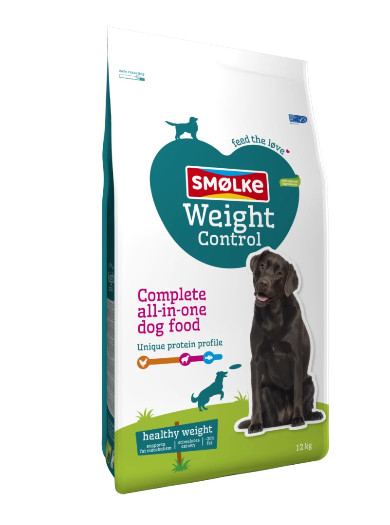 Smølke Weight Control is een complete Alles-in-één hondenvoeding speciaal ontwikkeld voor volwassen honden die last hebben van of neigen naar overgewicht. De voeding is samengesteld zonder tarwegluten en bevat 20% minder vet dan de reguliere Smølke brokjes voor volwassen honden. Smølke Weight Control is gemaakt met natuurlijke ingrediënten en heeft een uniek eiwitprofiel bereid met Nederlandse kip, MSC vis en Brits lam. Smølke Weight Control is een gezonde en gebalanceerde voeding die je hond helpt op een gezond gewicht te komen of te blijven. Natuurlijk zonder kunstmatige geur-, kleur- en smaakstoffen en chemische antioxidanten! Kippenmeel (19%), mais, gerst, rijst, sorghum, cellulose (5%), lamsmeel (4%), bietenpulp, kippenvet (gestabiliseerd met natuurlijke tocoferolen), gehydroliseerd eiwit, MSC-gecertificeerde vismeel (2%)*, vitaminen en mineralen mix, gist, MSC-gecertificeerde visolie (0,8%)*, cichorei (0,7%), natriumhexametafosfaat. *Uit een MSC gecertificeerde duurzame visserij. www.msc.org/nl Gereduceerd vetgehalte – Bevat minimaal 20% minder vet dan de reguliere Smølke droge brokjes voor volwassen honden. Stimuleert een verzadigd gevoel – Toevoeging van natuurlijke vezels stimuleert een verzadigd gevoel. Ondersteunt de vetverbranding – L-Carnitine en choline ondersteunen de vetstofwisseling. Wij adviseren om de voeding voor de aangegeven houdbaarheidsdatum aan je hond te serveren. Sluit de verpakking na openen weer zorgvuldig af en bewaar de voeding altijd op een koele en droge plaats.
