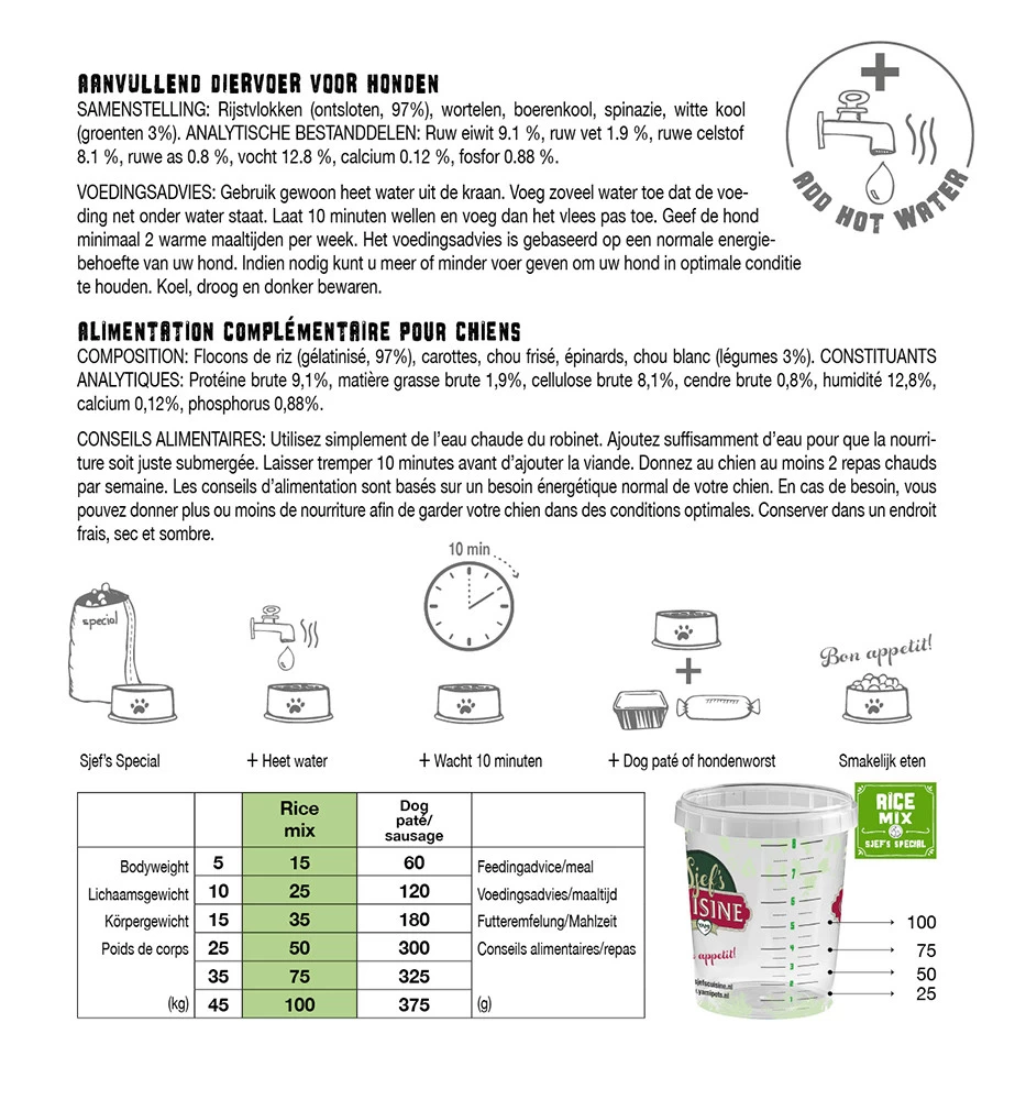 Yamipets Sjef’s Cuisine Rice Mix 2 staat bol van de groenten, vezels en vitamines. Lekker om warm te serveren met hondenworst, diepvriesvlees of een vleeskuipje, om zo de darmen te voorzien van vezels en vitamines. Zo geef je je hond de optimale productmix. De mix is zeer geschikt voor gewichtscontrole.
